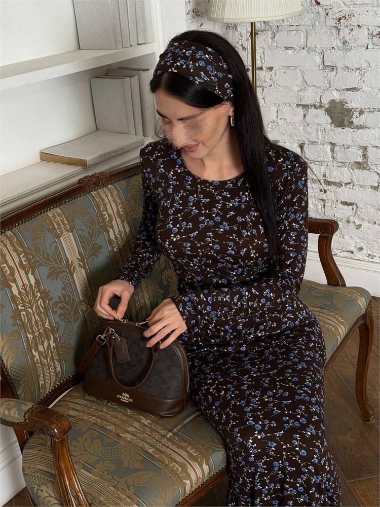 Платье базовое moda_ais со сборкой на талии, ткань премиальный бамбук голубые цветы на коричневом фоне